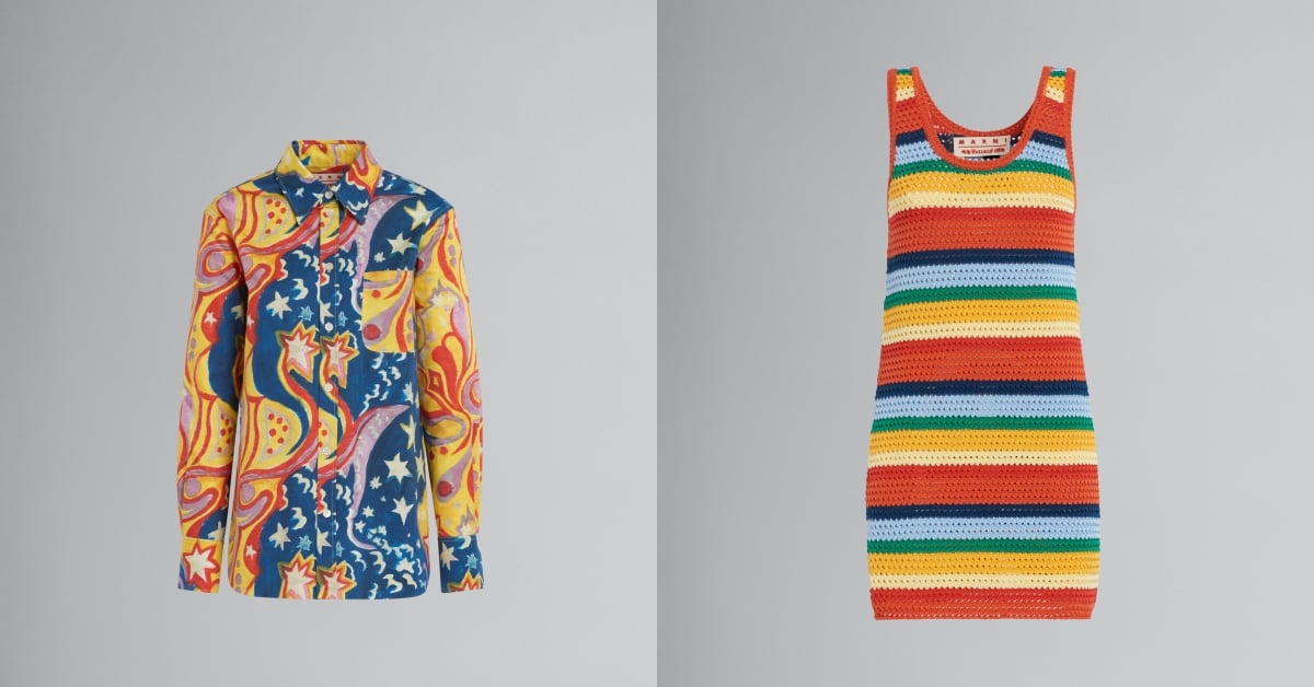MARNI與NO VACANCY INN這次的聯名系列要一次給大家滿滿的夏季氛圍,以拼接、拼貼、繽紛色彩為三大設計重點元素,並在服裝、包款等系列商品中融入鳥類、彩虹、花卉、星星等重點圖案,另外在針織系列單品則選用繽紛彩虹紋理來呈現濃厚70年代的復古美式氛圍,全系列單品包括男女服裝、配飾及鞋履等。
