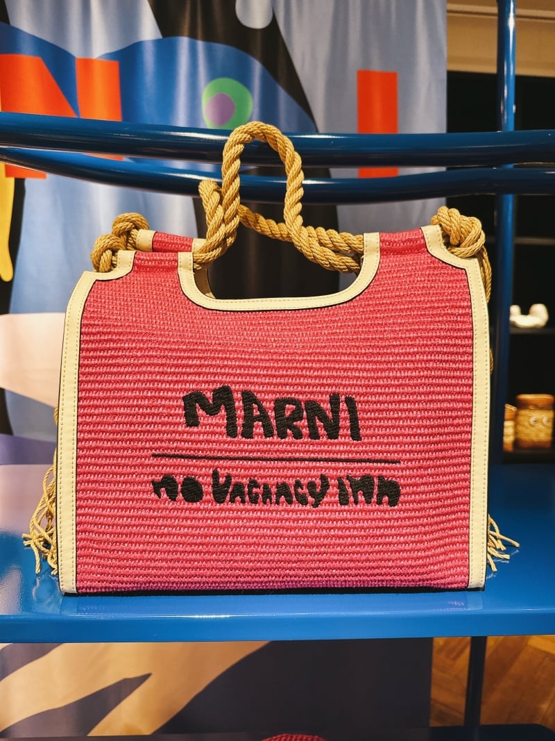 除了服裝之外,在這次的聯名中也重新演繹MARNI品牌經典的手袋,包括以拉菲草編織的Venice迷你水桶包和Marcel托特包,搭配撞色皮革滾邊,在細節設計處都能散發夏季的海灘度假風格,包身上還有雙方的品牌名,展現聯名系列的特色。