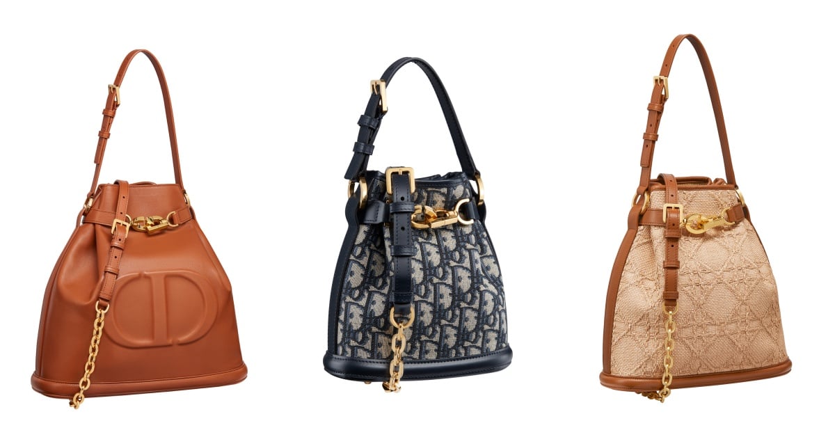 C’EST DIOR 摩卡棕小牛皮中型水桶包 NT.120,000、C’EST DIOR 海軍藍小牛皮拼接 OBLIQUE 中型水桶包 NT.120,000、C’EST DIOR 籐格紋拉菲草中型水桶包 NT.115,000