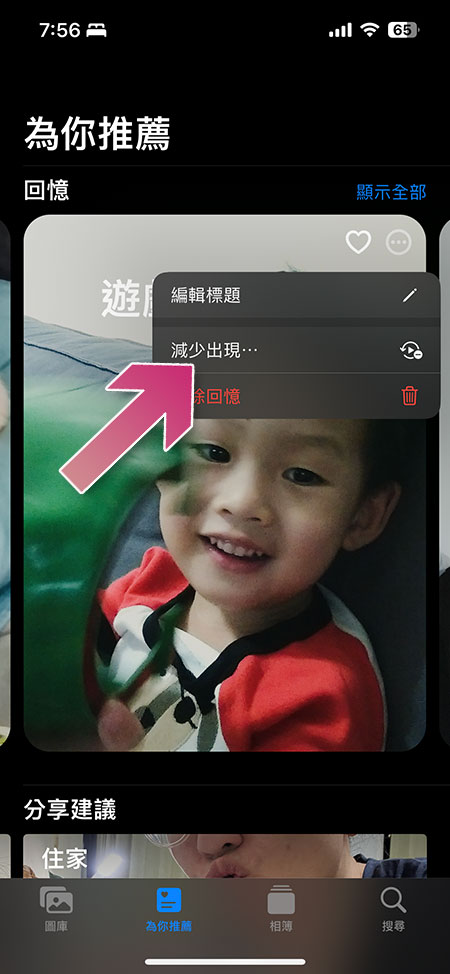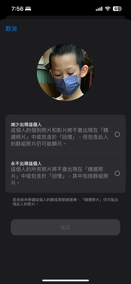 - 接下來你有兩個選擇,「減少出現」只是讓出現頻率變少,「永不出現」則是以後這個人的照片都不會出現在回憶與精選照片中。