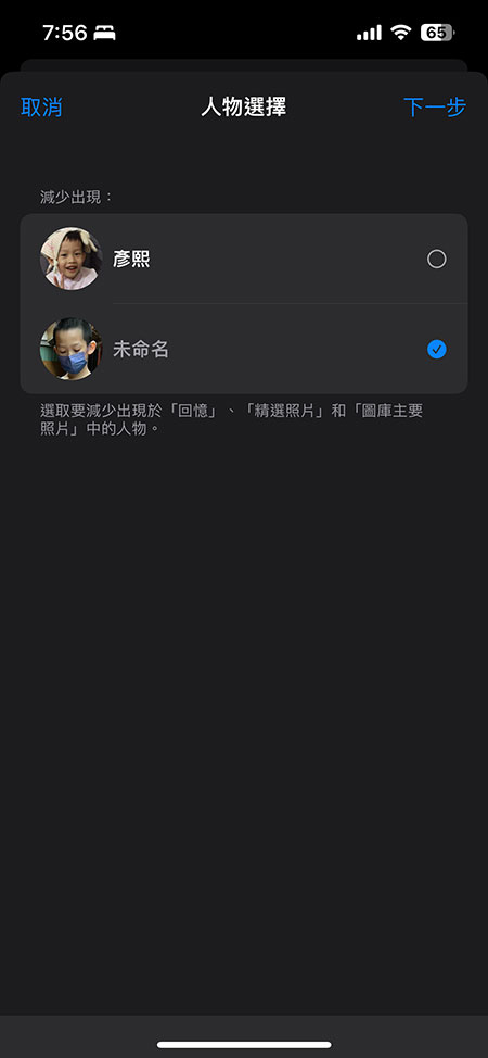- 接下來選擇想要減少展示的人物,點擊右上角的「下一步」。