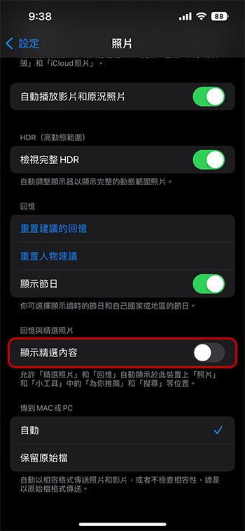 - 捲動到最下方,把「顯示精選內容」這一項關閉,如此一來所有精選照片將不會顯示在設備的其他地方,而是僅在你的照片圖庫和相本中可以看到。