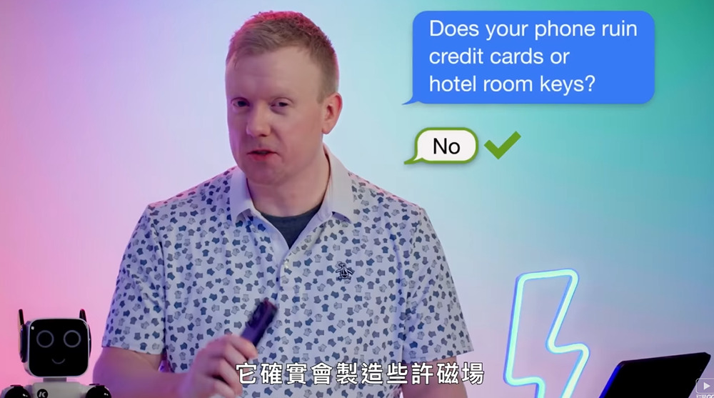 另一個也蠻常看到的「手機可不可以跟信用卡或飯房卡放一起?」,David Payette 表示手機確實會製造些許磁場,但並沒有強到會將信用卡或飯店房卡消磁。不過這裡有一個要注意的。MagSafe 和其他磁吸式充電器就是例外了,千萬不要把信用卡放在 iPhone 和 MagSafe 保護殼之間,這就會被消磁: