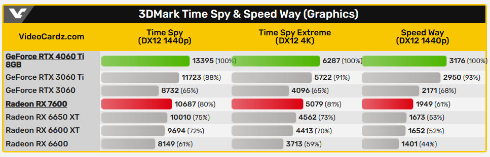 - GeForce RTX 4060 Ti 8GB 在 3DMark Time Spy 模式(DX12 1440p)中,拿到 13395 分,比上一代 RTX 3060 Ti 快約 12%,Time Spy Extreme 模式(DX12 4K)獲得 6287 分,Speed Way 則是 3176 分。