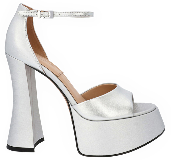 擁有簡潔線條的「Michelle」真皮厚底粗跟鞋,俐落優美的U型鞋面設計悄悄為雙腳延伸,在視覺上打造出纖細感,銀色光澤感真皮結合防水台鞋跟造型,展現亮麗復古風情。(NT$ 3,290)