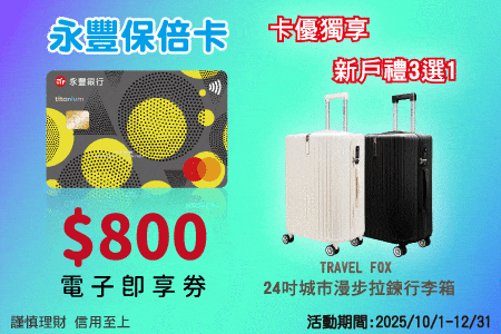 永豐銀行-保倍卡 | 活動時間:2025/10/01~2025/12/31 新戶透過卡優指定活動網頁申辦永豐保倍卡, 核卡後30天內,一般消費或全聯消費【累積消費滿2,000元】或【綁定特選行動支付累積消費滿1,000元】享卡優專屬好禮三選一: 1. THOMSON 溫感金絲玉臉部按摩器 2. TRAVEL FOX 旅狐 24吋城市漫步拉鍊行李箱(不挑色) 3.【宜睿】800元電子即享券 (16大品牌讓收券者自選面額,多次自由選配-王品集團、7-ELEVEN、全家、家樂福、大潤發、屈臣氏、特力集團、漢來美食通用券、遠東SOGO百貨、遠東百貨、遠東巨城購物中心、foodpanda、寶雅集團、漢神百貨/漢神巨蛋、瓦城集團、爭鮮集團) *持卡人將於符合本活動回饋資格後,第四個月起陸續發送兌換簡訊至正卡人於永豐銀行留存之手機號碼。請於手機簡訊告知之期限內點擊專屬兌換連結至卡優指定網頁完成贈品選擇及兌換。 *此卡優通路限定加碼禮活動與永豐銀行新戶首刷禮活動僅能擇一參加 ▶立即線上申辦 |