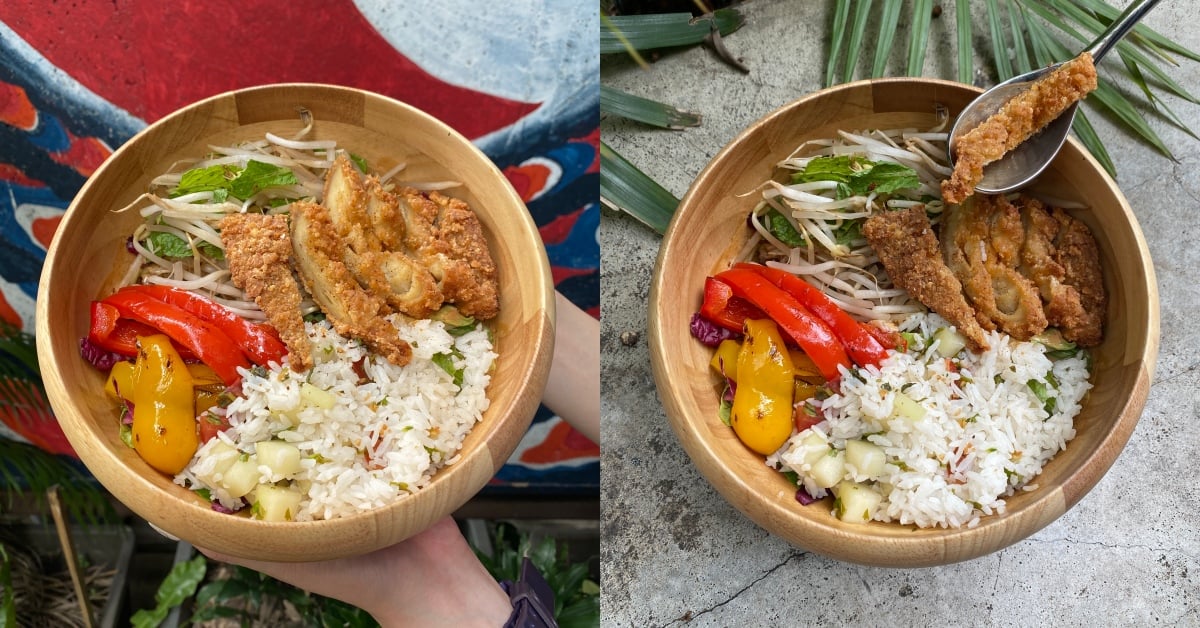 飽足感料理「南洋風味椒麻雞沙拉」根本是夏天必點清單!主食有全植椒麻雞、椰香風味飯、特製沙爹醬、小黃瓜沙拉等多款食材,特別是裡面的蔬菜都經過「炙燒炭烤」,除了享受泰式酸辣風味,還多了層煙燻香氣,不自覺就會一口接著一口呀!主廚Ella也分享特別選用生的豆芽菜,比起煮熟過後吃起來更清爽,搭配炸物一起吃更是絕配,這道推薦給想吃沙拉又追求有飽足感的妞妞!中午快跟同事們點外送吃啦~