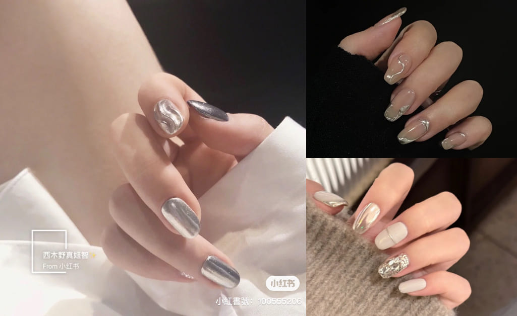 自從大理石紋理、石紋面料運用的造型概念竄起後,美甲造型也盛行增添「手感體驗」!不論是擬真鋁箔紙揉捏過的抓皺感,還是銀箔線條紋理的點綴,甚至猶如水銀般滑動的水感輪廓,藉由銀色的詮釋,讓美甲格外有科技時髦感。