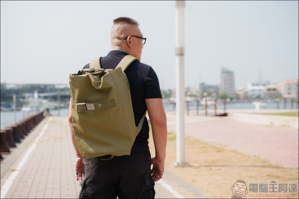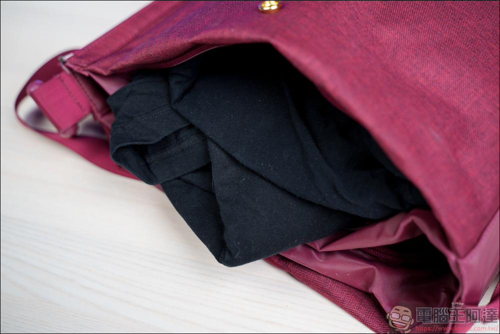 比較有趣的是,如果你在手提模式下,分別將上下鎖扣的公母頭對調來鎖,你還能讓 FlipBag 翻轉背包變身成單肩包、斜肩包來使用,可變形可說是相當多元 :