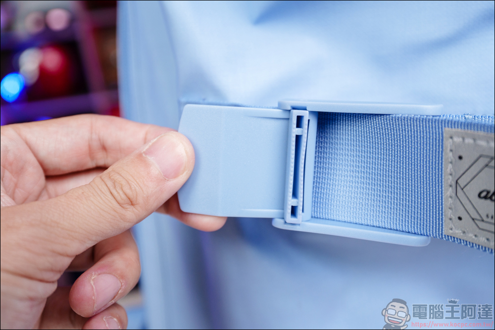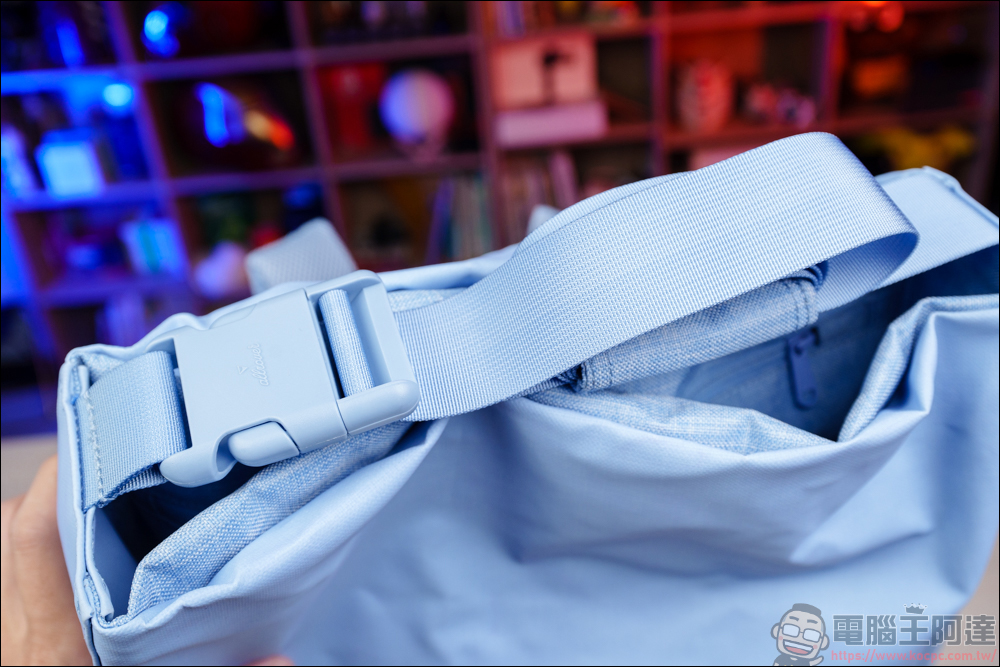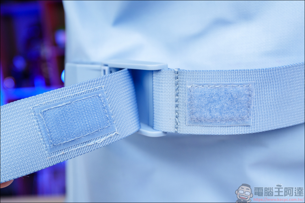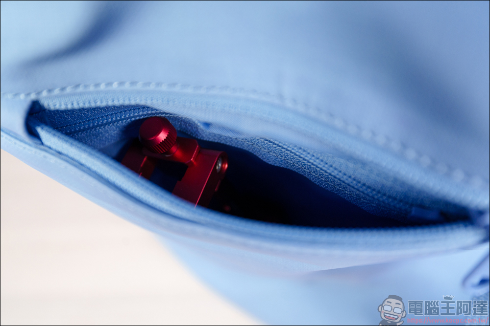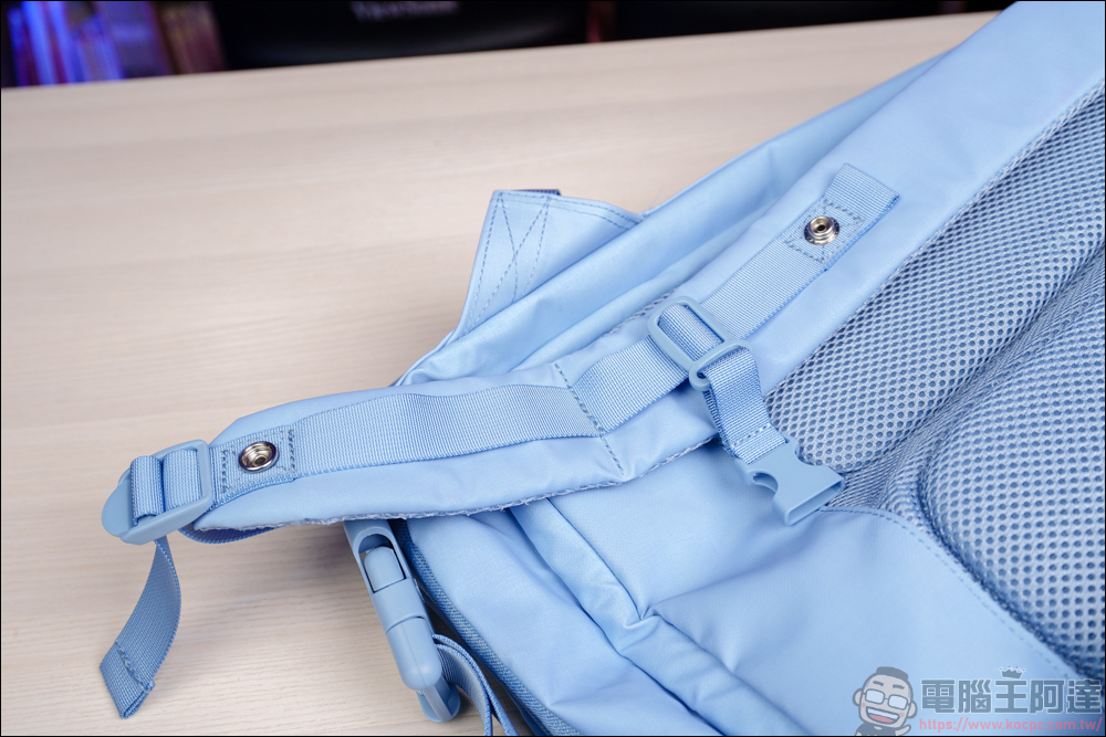 在背帶這邊有個小巧思,因為 FlipBag 翻轉背包具有背包 + 手提包轉換的設計,要轉換手提模式時,背帶下方這邊要反向扣上進行收納,這樣變成手提包時,才不會因為背帶太長而跑出來 :