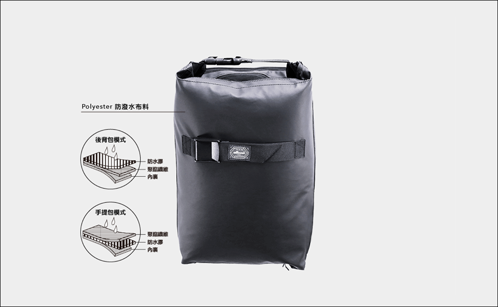 材質方面,後背包與手提包的外層就略有不同 ( 手提包的外層就是後背包的外層 ),後背包的外層的材質採用 防潑水膠 + 100% 聚酯纖維 ;而手提包的外層則是 100% 聚酯纖維 + 防潑水膠,摸起來像是丹寧布的材質,而兩種型態下都有防潑水的設計。 ( Ps.僅防潑水,並無防水設計 )