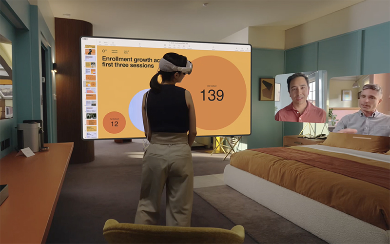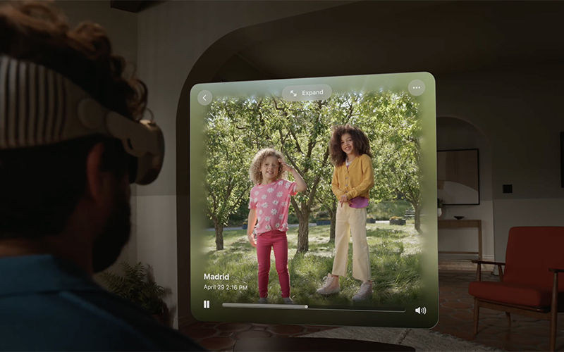 搭載Apple第一台3D相機,讓使用者捕捉、重現並搭配空間音訊,以真實的尺寸比例、鮮豔的色彩,每一張iPhone拍攝的全景照片都能展開圍繞使用者,彷彿置身其中。充滿空間感的FaceTime利用使用者所在的空間,通話時每一位參與者都會即時以真實大小的方塊呈現,搭配空間音訊,讓聲音聽起來就像從那個人所在的地方發出來的一樣。值得一提的是使用者還可一同看電影、瀏覽照片或是合作簡報。
