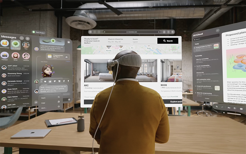 visionOS搭載全新的3D介面,讓數位內容看起來、感覺上就像在使用者的實體世界存在。透過自然光線和陰影的變化,幫助使用者理解比例與距離。使用者透過眼睛、雙手和語音來控制,只要輕鬆地看著它們、手指輕捏來選擇、輕拂手腕來滾動,或使用聽寫輸入。同時搭載EyeSight,幫助使用者與周圍的人保持連結,有人靠近配戴Vision Pro的使用者時,使用者會感覺眼前變透明,讓使用者看到靠近的人,同時顯示使用者的眼睛。