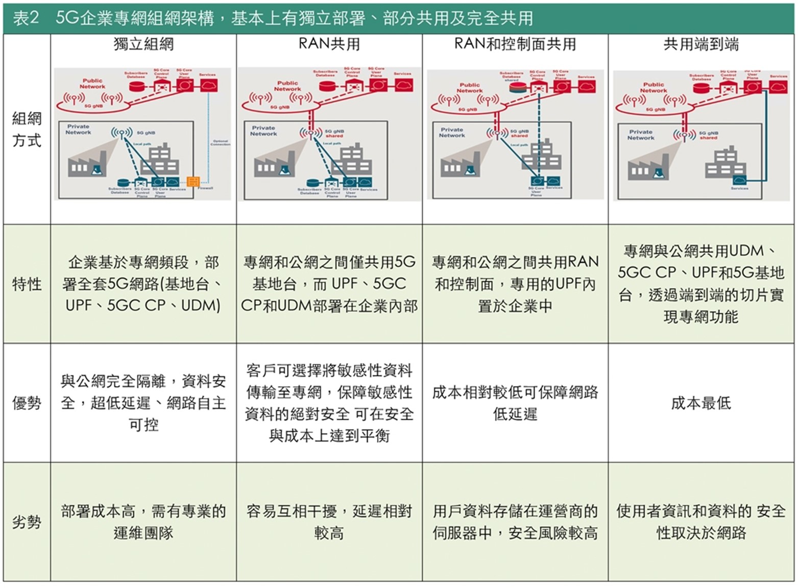 企業取得企業專網頻譜有三種方式:自有頻譜、與電信業合作、共享頻譜。若依5G基地臺、MEC、核網部署方式不同分為以下四種,優缺點如下: