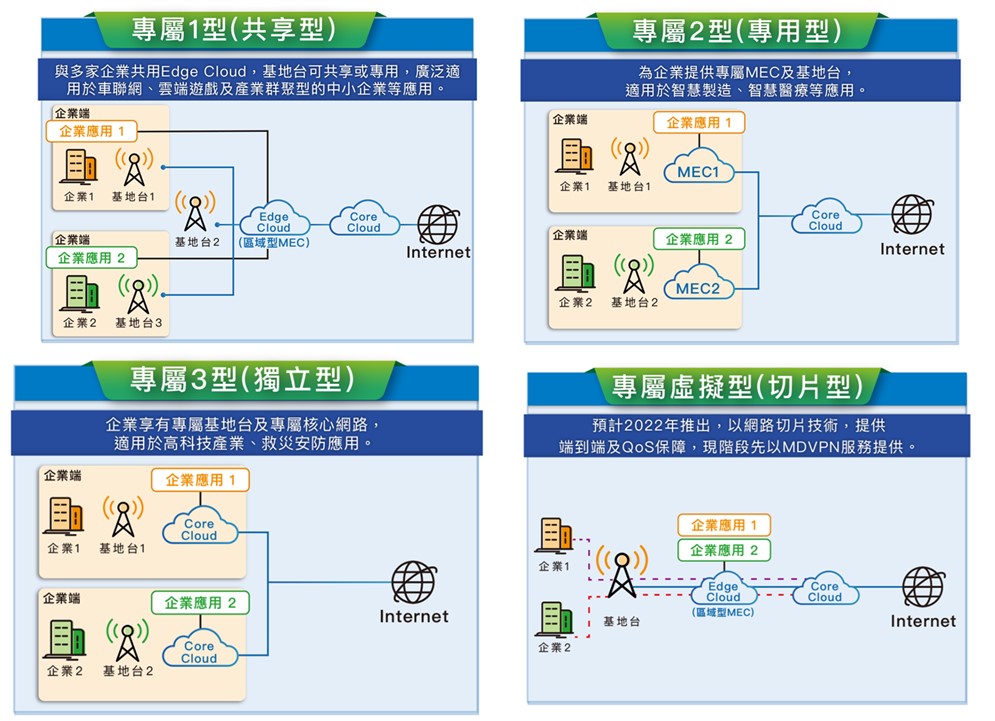 中華電信自5G開台以來持續搶攻5G專網,主要涵蓋4種部署架構方案。企業合作案截至2022年年底已超過百件,聚焦於企業建置智慧醫療、智慧製造、文化展演、智慧交通等各領域,其中又以智慧製造領域應用最為廣泛。中華電信目前已協助多家知名企業建構5G專網,包含台積電在美國亞利桑那州的新廠乃由中華電信協助建構自動化運輸及遠端監控等5G專網服務; 中華電信亦協助中鋼導入5G專網,提供長達900公尺鋼渣運輸軌道的即時監測及遠端操控等功能; 中華電信於北市聯醫中興院區建置5G專網整合應用行動超音波、五官鏡、行動醫療行李箱和遠距醫療平台等技術與醫療設備,以實現居家醫療遠距會診..等等。