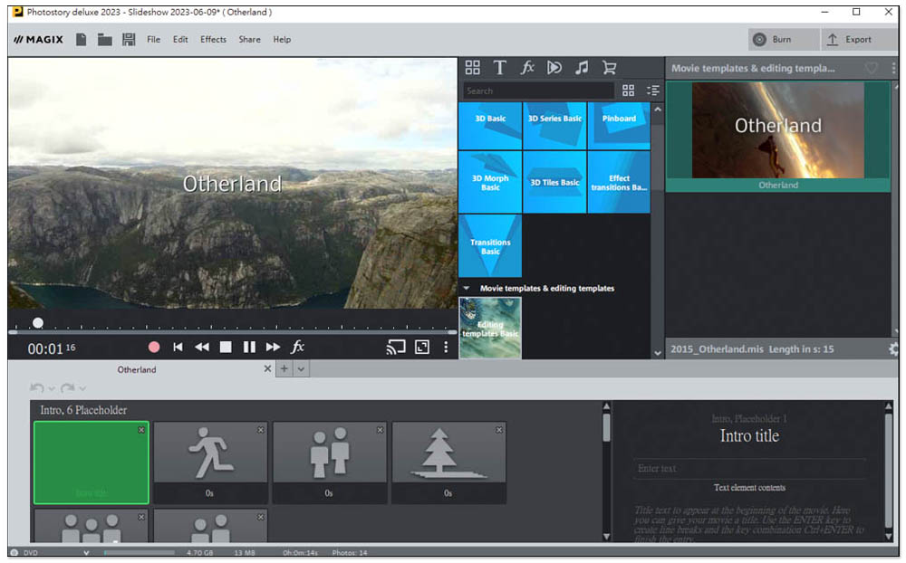Magix Photostory 也是一款照片幻燈片製作軟體,目前還不支援中文,操作介面稍嫌複雜一點,可能需要一點時間才能熟悉。這款最大優點在有很多單一的照片範本特效,讓你可以加進照片影片製作裡面,不過一整部幻燈片的範本就只有一個,這我就覺得不太夠。