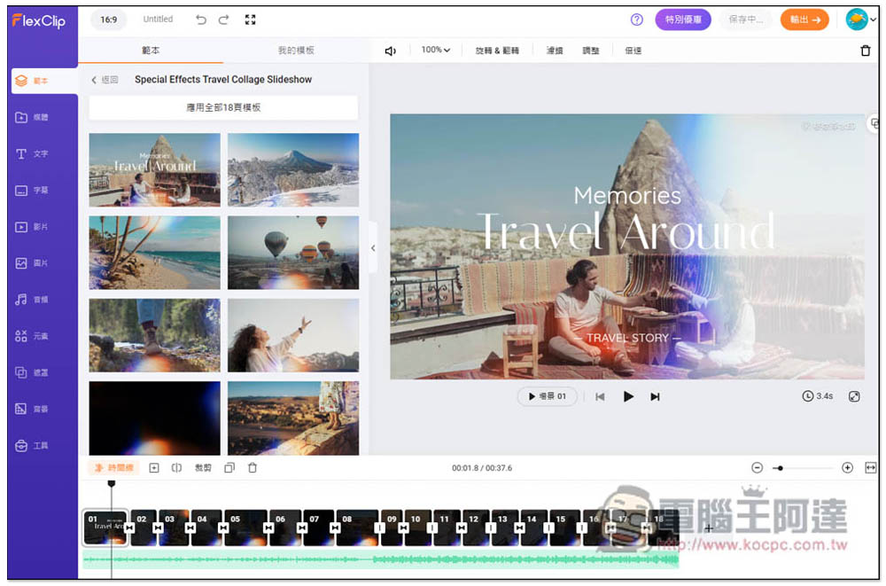 對於不想在 PC 裡安裝工具的,那就可以考慮使用這款 Flexclip 免費線上工具,支援繁體中文,功能超級豐富,不僅有免費範本,還能為幻燈片加上文字、字幕、影片、符號貼紙等,每一個範本也都搭配好背景音樂,對於懶人來說一定會喜歡。