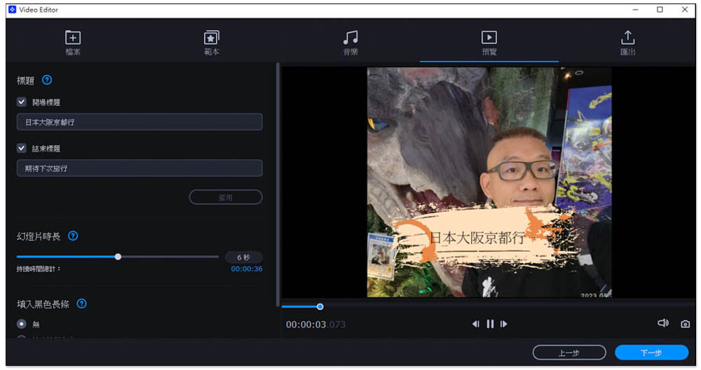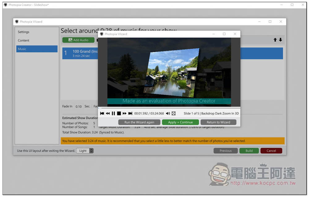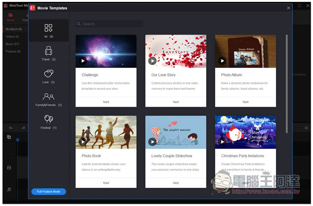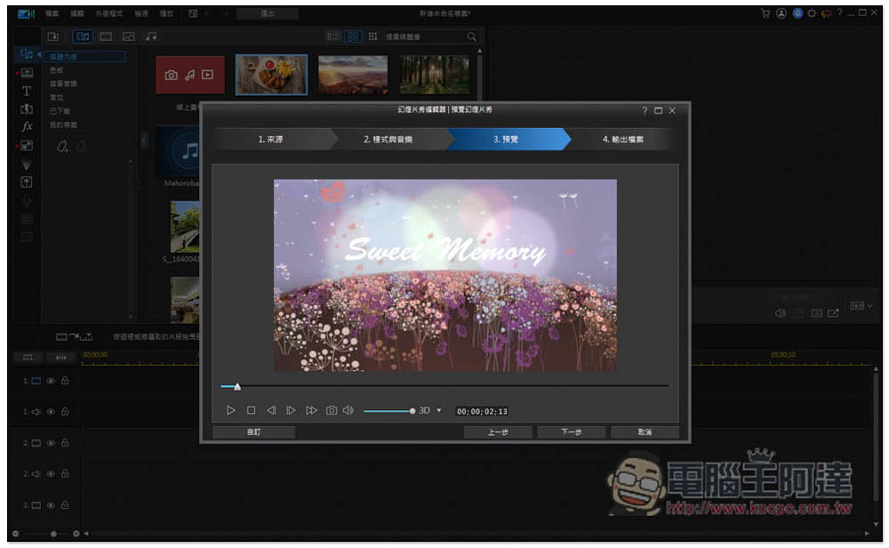 PowerDirector 大家應該很熟悉,就是威力導演影音剪輯軟體,有內建照片影片製作功能,不僅有 11 個免費範本,免費音樂也超級多,上百首任選,這點還蠻不錯,製作過程也很簡單,只是免費範本的轉場效果大多都有點過時,很容易就會看出是套版的,而且質感沒有說很高,感覺的出來照片幻燈片只是附加,實際還是剪輯影片功能比較強大。