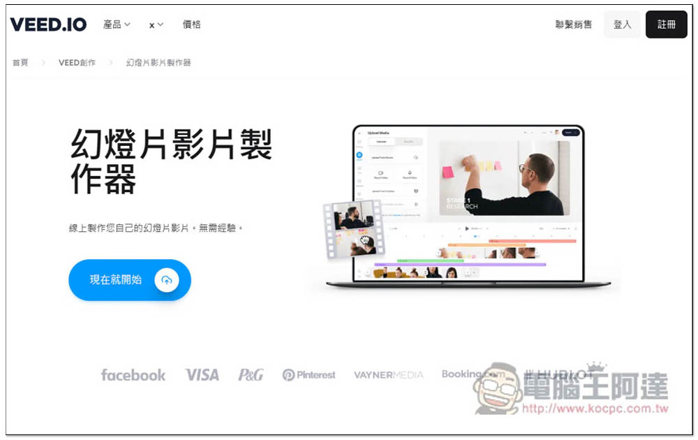 VEED.IO 也是一款線上幻燈片影片製作器,無需安裝,打開瀏覽器就能用。雖然首頁有中文,但進到製作器後,就會變成英文,操作介面不僅稍嫌複雜,也沒有什麼免費範本,一切都要重頭設計,不推薦給新手使用,比較適合有設計底子的人。