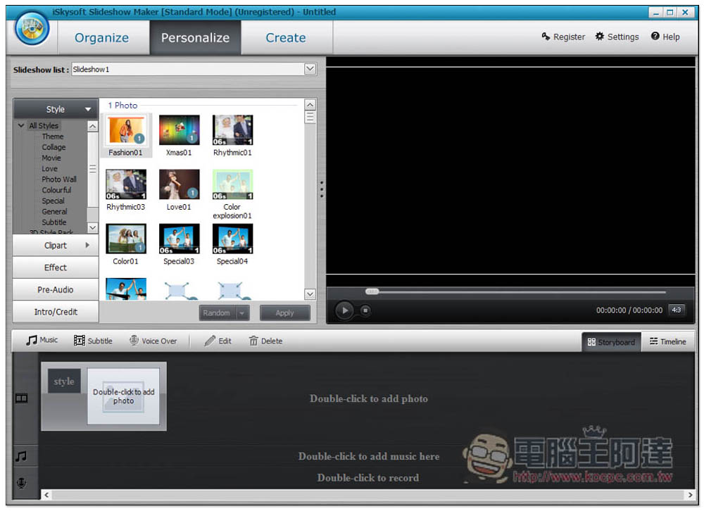 Iskysoft Slideshow Maker 是一款蠻老牌的軟體,提供照片幻燈片製作功能,有兩種使用模式,「一般」和「進階」,建議用一般就好。目前僅支援英文,介面設計非常復古,提供的範本也是一些很老舊的呈現方式,對於年紀比較大的人可能會喜歡,但年輕人就不推薦這款了。