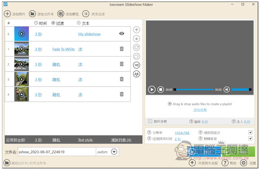就如同它的名稱,Icecream Slideshow Maker 是專為照片轉影片而生的幻燈片製作、照片輪播軟體,提供簡體中文,有超過 25 種照片過渡特效,但很可惜沒有免費範本,都需自行設定,像是照片停留時間、選擇要用的過渡特效、以及是否加入文字,也支援添加背景音樂,影片輸出格式只有 4 種,不支援 MKV。