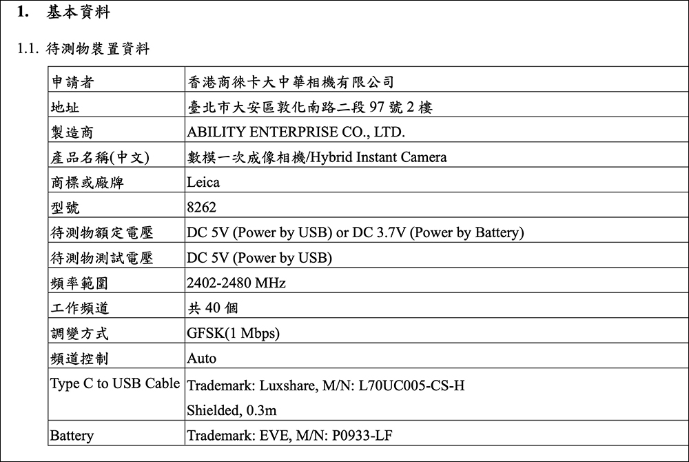 [caption id="attachment_495918" align="alignnone" width="1000"]在 NCC 文件找到 Leica Sofort 2 的基本資料,內建 EVE P0933-LF 電池,經查詢應該是 700mAh 的容量。