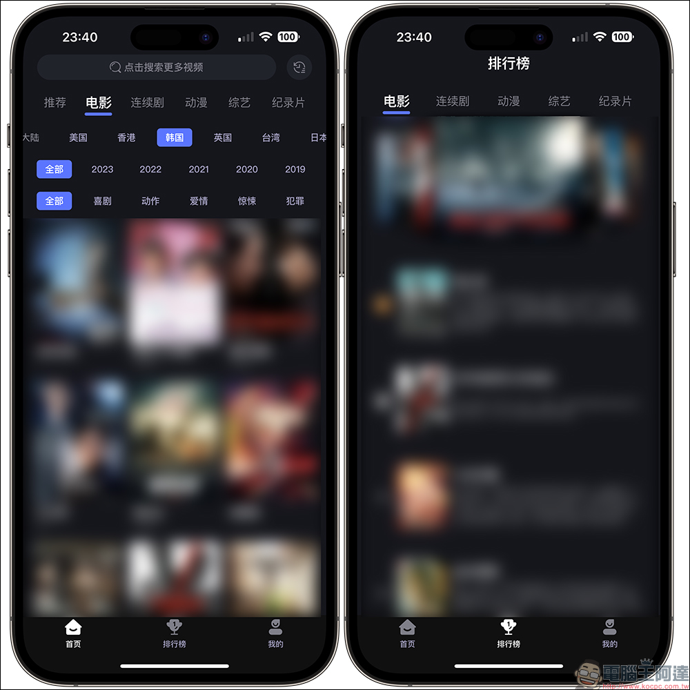 在影視模式的介面和其他功能相似的影視 App 相同,提供推薦影片、電影、連續劇、動漫、綜藝以及紀錄片。用戶也能透過篩選去尋找不同國家、年份、類型的影片,在「排行榜」也有整理近期熱門的電影、連續劇、動漫、綜藝和紀錄片,讓使用者更快找到最近的熱門影片。