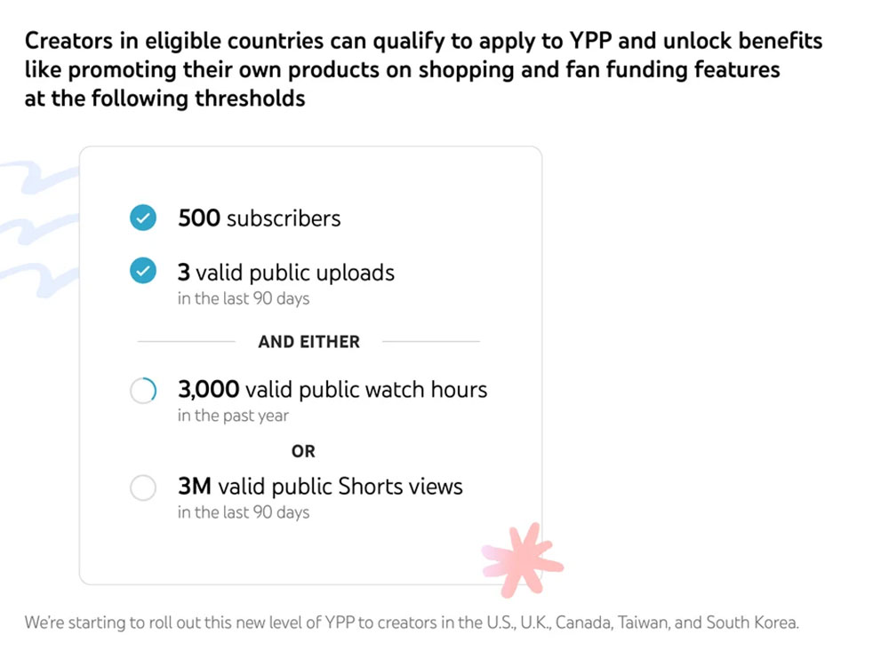 這次發表的新規則內容要求與舊規則框架相同,但門檻要低得多。首先,你的頻道必須要擁有 500 名訂閱者,其次必須在過去 1 年內有至少 3,000 小時的公眾總點擊觀看時數,或是 3 百萬次的 Shorts 公眾總觀看次數, 此外,你的頻道需要在過去 90 天內至少公開上傳 3 部公開影片。只要滿足上述條件就有資格讓你的頻道成為合作夥伴,從而可使用會員資格、超級感謝、超級留言與 YouTube 購物產品宣傳等功能。