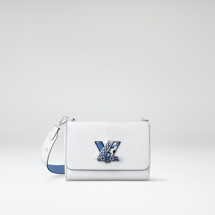 「Twist」摩登的外型,加上細膩的工法,讓該包款成為許多女孩得最愛,這次設計師將其經典包扣以獨特的技法鍍上藍色圖文,其寬背帶亦以同樣的色調呼應,讓包款整體充滿輕盈的氣息。(商品售價:NTD156,000)