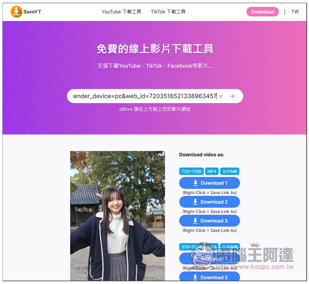 我測試 TikTok 也沒問題,而且每個解析度還提供三個載點備用,下載時需要打開右鍵選單 -> 點擊另存連結為:
