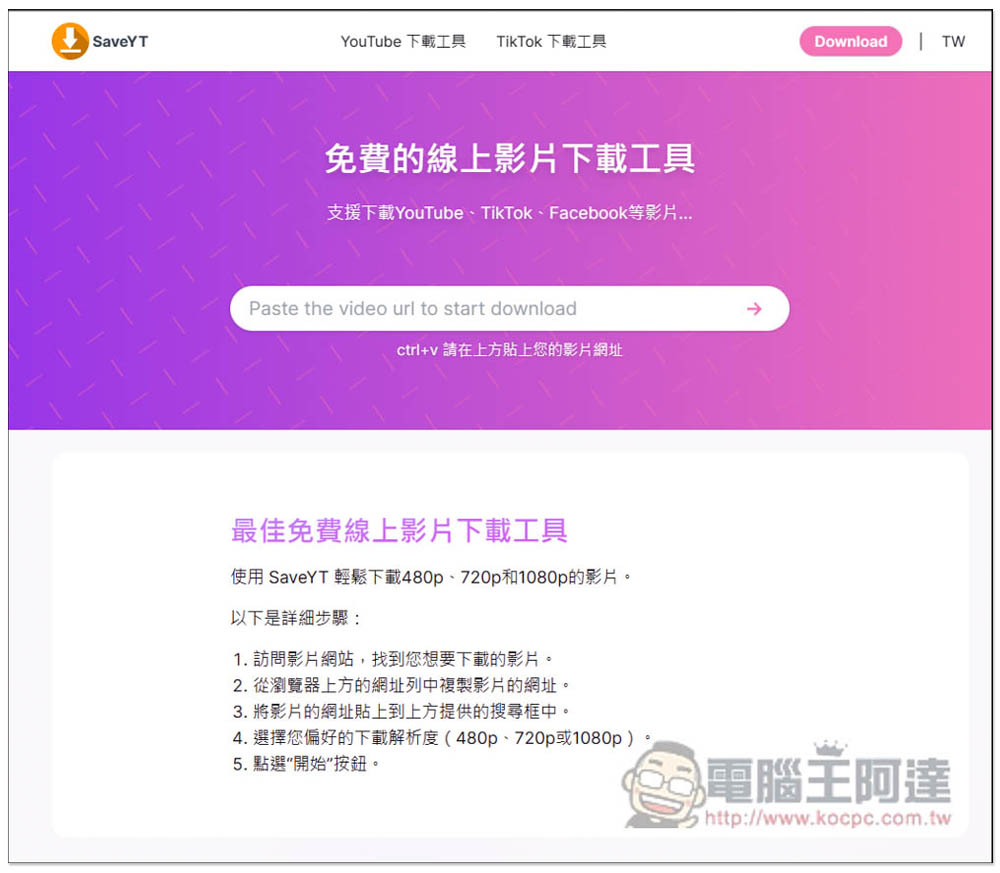 SaveYT 因為無廣告,頁面設計非常乾淨,使用方式跟大多數線上下載工具一樣,進到網站之後就把你要下載的影片網址貼上,就能獲得載點。根據說明,它可以下載最高 1080p 解析度的影片,2K、4K 就不行: