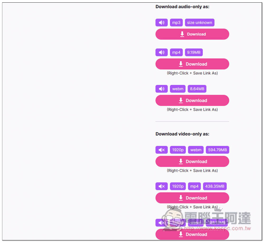 最後也提醒一下,這類線上影片下載工具通常每隔一陣子就有可能失效,因此如果你測試無法下載,那就有可能下載功能暫時壞了,可以試試之前我們介紹過的其他線上工具,如:Savemedia.Website、Youtube4KDownloader、YT5s.io 等等,手機用戶也能用這些網站。