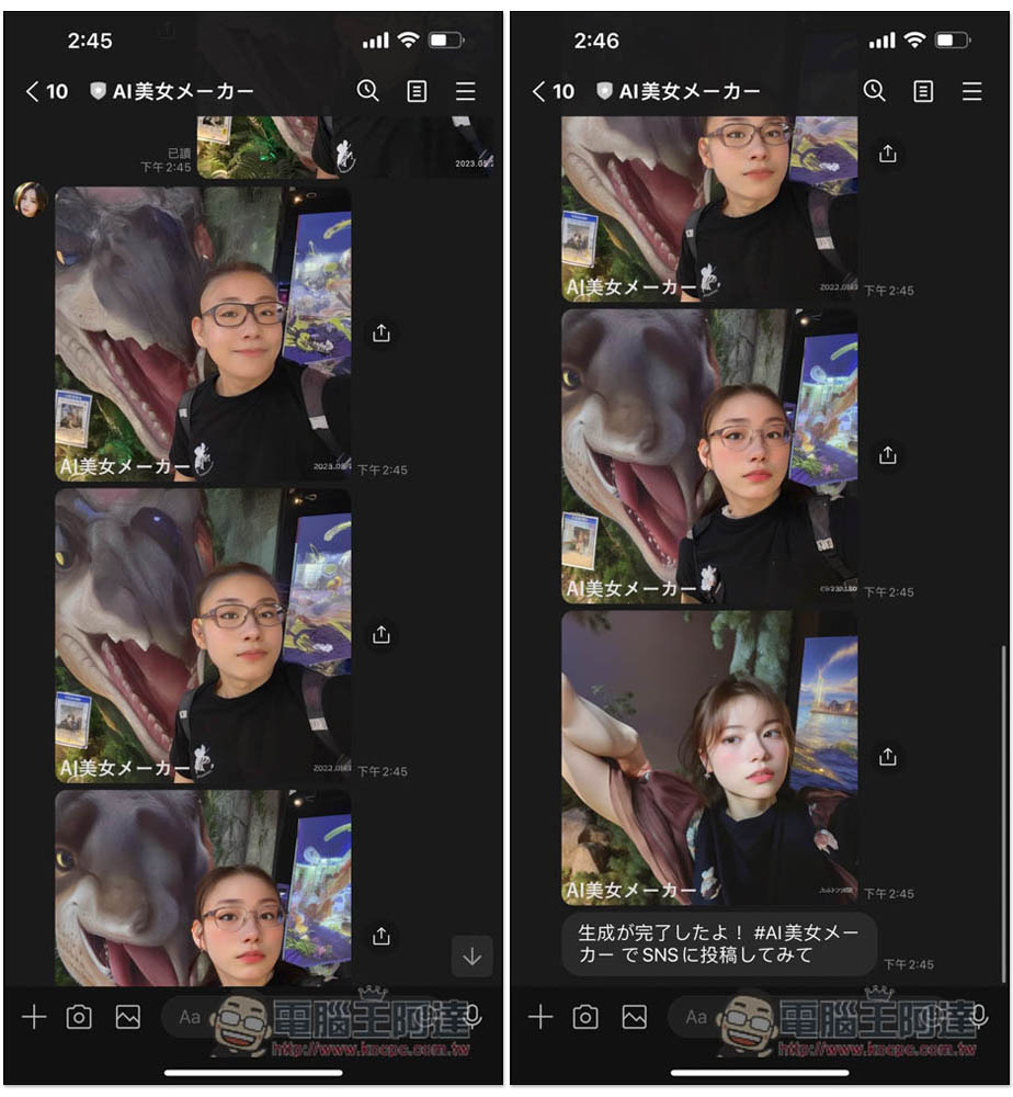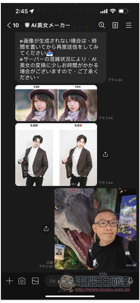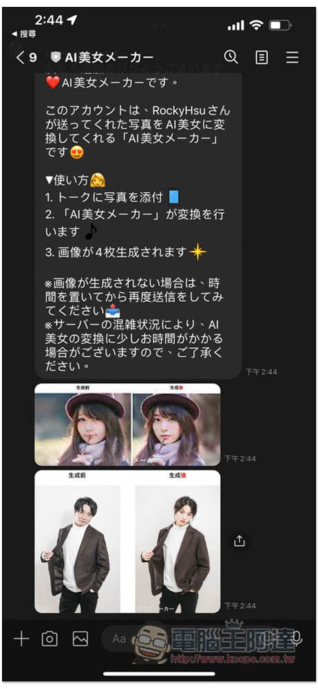 AI 美妝師雖然是日本公司推出的 LINE 機器人,但過程中不需要講任何話,只需上傳照片,因此使用上不會有任何問題。唯一要注意是因為照片會傳給這公司,因此記得不要傳太重要、個人的照片,大約幾秒鐘美女圖就轉換完成了。