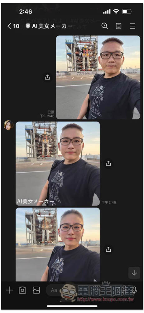 我先測試阿達這張照片,傳送之後會看到機器人已讀,這時它也不會發送任何訊息,就放著等待幾秒鐘的時間,轉換後的 4 張圖片就會傳給你。另外照片選擇上,盡量找臉部沒有被任何東西擋住的,如果有被手或其他東西擋住,轉換後的效果會比較差,但還是可以接受: