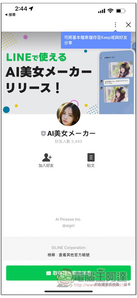 點擊上方連結來加入 AI 美妝師(AI美女メーカー)好友,或是手動輸入尋找 @aigirl 也行: