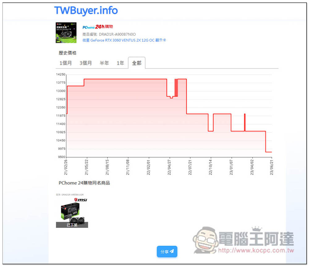 為此我也用電商價格趨勢查詢工具,來查看 RTX 3060 在台的價格變化,果然跟國外一樣,這一個月降價很多,像微星 GeForce RTX 3060 VENTUS 2X 12G OC 顯卡這張,原本已經跌到 NT$10,925,現在又再度降到 NT$9,790,跌幅超過 10%: