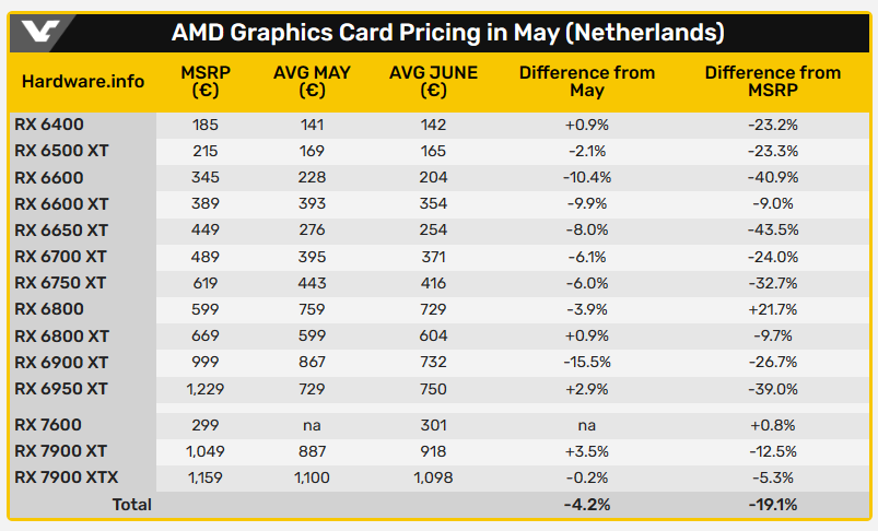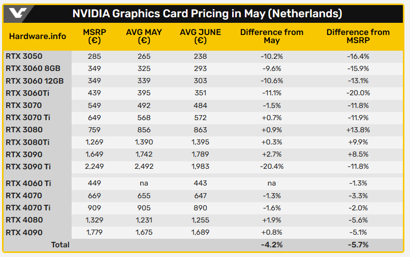 根據外媒 VideoCardz 的消息,荷蘭 Hardware.info 整理這一個月 NVIDIA GeForce RTX 30 / 40 系列,以及 AMD Radeon RX 6000 / 7000 系列的價格變化,從中可以發現到,隨著新一代中低階顯卡 RTX 4060 系列推出,RTX 3050 和 RTX 3060 系列的價格受到不小的影響,像是 RTX 3060 8GB、12GB 和 RTX 3060 Ti 的平均價格跟上個月比,便宜了 10%,如果跟建議售價比較,那差距又更大了: