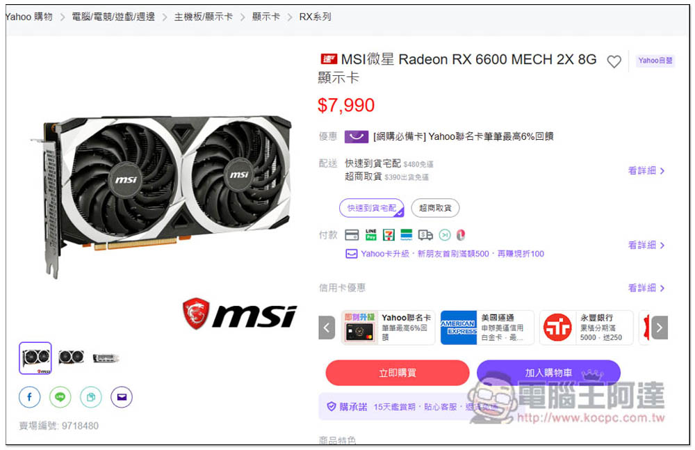 至於 AMD Radeon RX 6600,我看網購平台的庫存都不多,因此價格就沒有變動,不過原價屋這類硬體專賣店就比網購平台便宜,像這張微星 Radeon RX 6600 MECH 2X 8G 顯卡在 Yahoo 購物賣 NT$7,990: