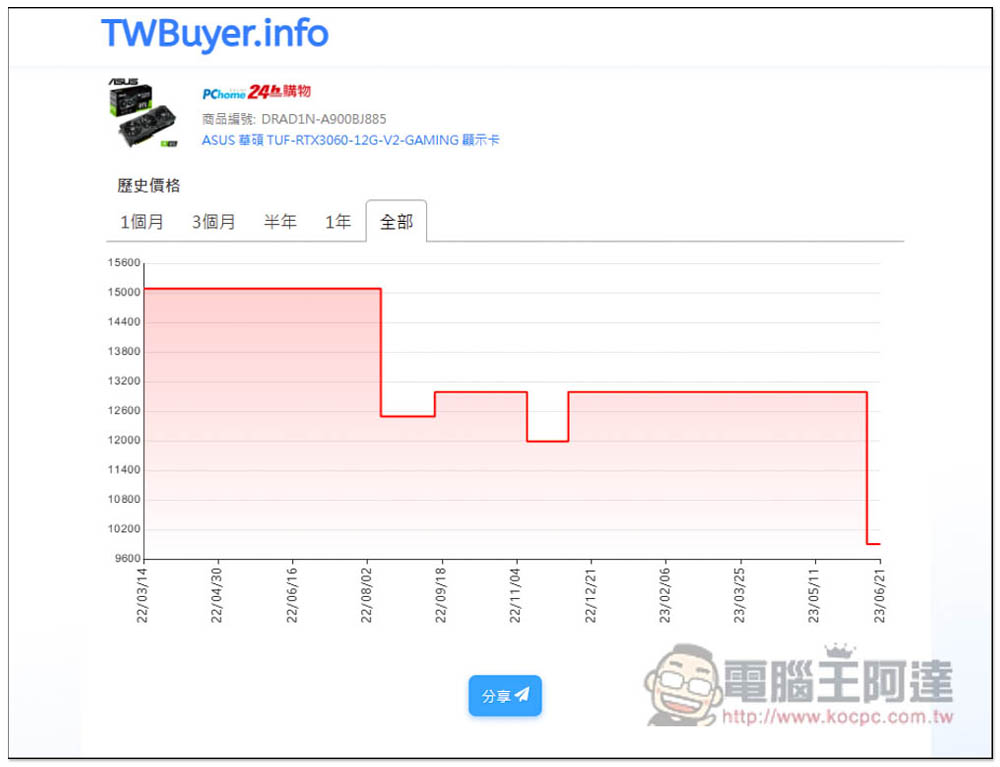 華碩 TUF RTX 3060 12G V2 GAMING 顯卡也一樣,而且這張還比較誇張,之前降到 NT$13,000 附近,現在是 NT$10,590,跌幅將近 20%: