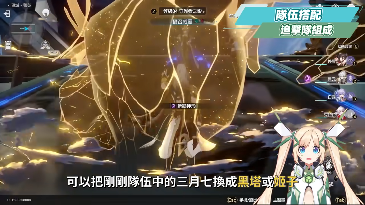 第二隊可以參考的則是模擬宇宙歡愉流可以使用的追擊隊,可以把剛剛隊伍中的三月七換成黑塔或姬子,甚至是景元,克拉拉可以轉為半坦半輸出的定位,搭配黑塔同為追加攻擊的技能機制,能在模擬宇宙中選擇歡愉命途來挑戰,搭配克拉拉的反擊壓制敵人血線和削韌效率,也能頻繁觸發黑塔和姬子的追加攻擊。而跳脫追擊流的輸出角色選擇,其實也可以選擇其他的智識或巡獵角色,只要不要搶到克拉拉的嘲諷值就可以了,因此像是希兒、青雀等角色也都可以放,加上克拉拉比較不吃戰技點,所以放入青雀也能夠安心摸牌。
