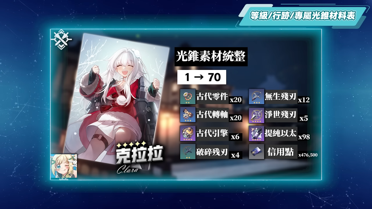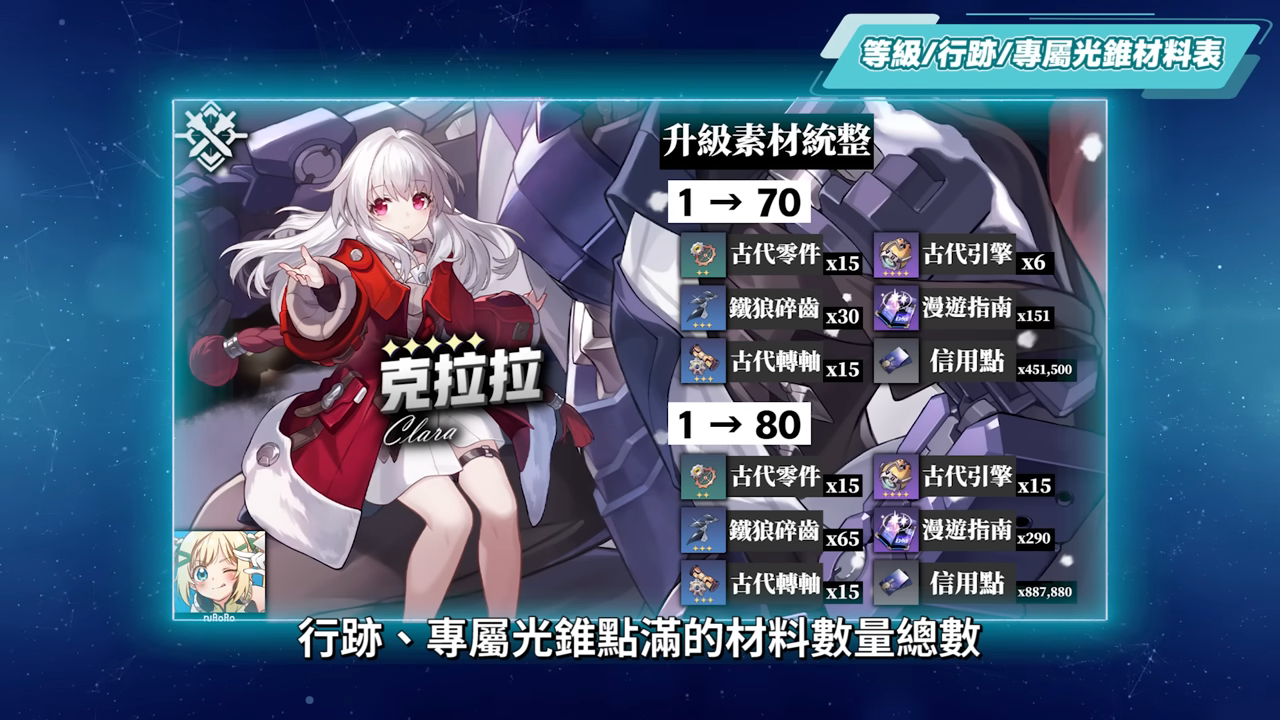 這裡也附上克拉拉1~70等、1~80等、行跡、專屬光錐點滿的材料數量總數,提供給需要培養克拉拉的肉肉們準備,有需要的話也可以再自行截圖保存。