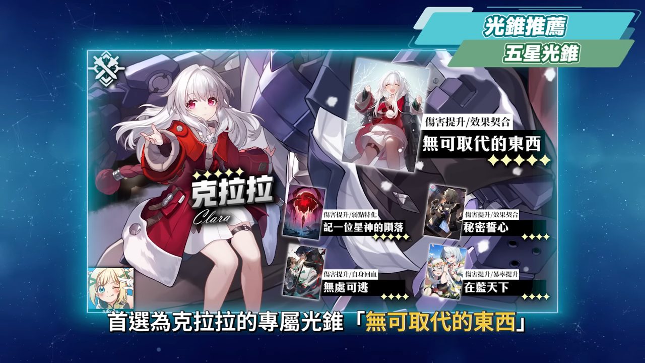 光錐推薦,首選為克拉拉的專屬光錐「無可取代的東西」,能穩定提高攻擊力,並能在消滅敵人或受到攻擊後,立即恢復生命值,還能增加攻擊傷害,也因為有回血機制,所以也可以讓克拉拉單人成隊攻略模擬宇宙,而除了專屬光錐外,在黑塔的模擬宇宙商店中可以兌換的「記一位星神的隕落」也不錯,並且還能免費兌換到滿疊影,效果部分為當裝備者釋放攻擊時,能夠疊加攻擊力,最高可疊加4層,以及當裝備者擊破敵方弱點後,造成的傷害提高持續2回合,搭配反擊機制的克拉拉,削韌效率本身就不錯,再搭配這個光錐的增傷效果也很容易能夠吃到。