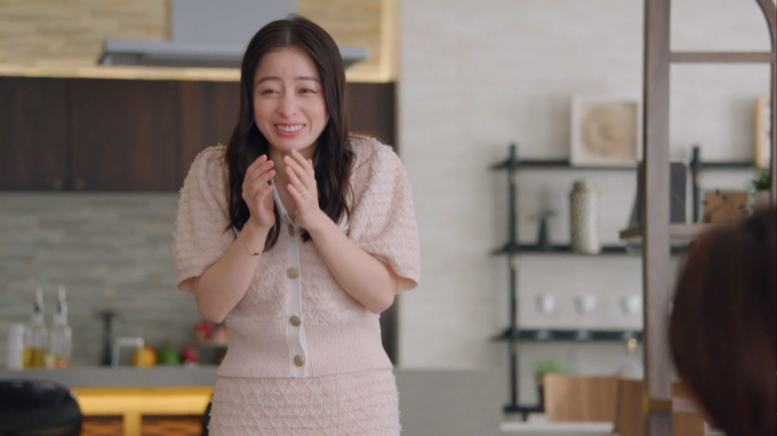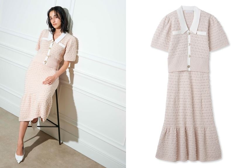 因為說到蜜月旅行要生小孩,而產生莫名妄想的橋本環奈,當下所穿的「嫩粉色提花針織洋裝」,來自成熟典雅的日本品牌CELFORD。使用提花針織的材質,給人低調又不失優雅的感覺,看似兩件式的設計,外加魚尾的下擺,是不是超美的呢~不過,這套的售價也相對貴了一些,為42,900日幣。