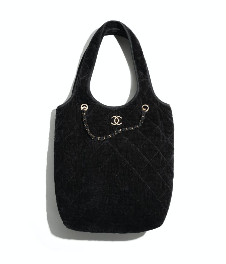 在包款的設計上 Chanel 更為輕鬆的方式呈現,例如這款購物包設計師運用輕盈好攜帶的絨布材質為設計主軸,並搭配上經典的菱格紋衍縫以及皮穿鏈背帶點綴,讓整體在休閒之餘仍保有品牌奢華的氣息。(商品售價:NTD164,800)