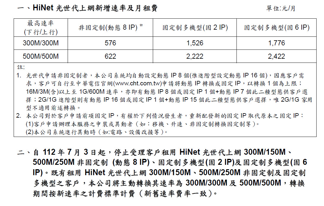 按照公告,中華電信針對HiNet 光世代300M/150M、500M/250M非固定制及固定制多機型之客戶,主動升級為「雙向對稱頻寬」,也就是上傳及下載速率皆各自統一為300Mbps、500Mbps,轉換期間則按新速率之計費標準計費(新舊速率費率一致)。