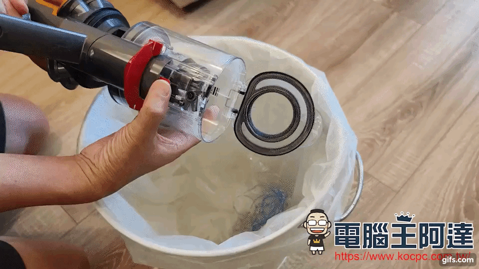 使用吸塵器後,只要這樣輕輕一推,蓋子就會彈出將灰塵垃圾倒入垃圾桶,不過通常都建議在戶外陽台使用,阿達還會再拿個垃圾袋包起來清,避免灰塵飛揚。
