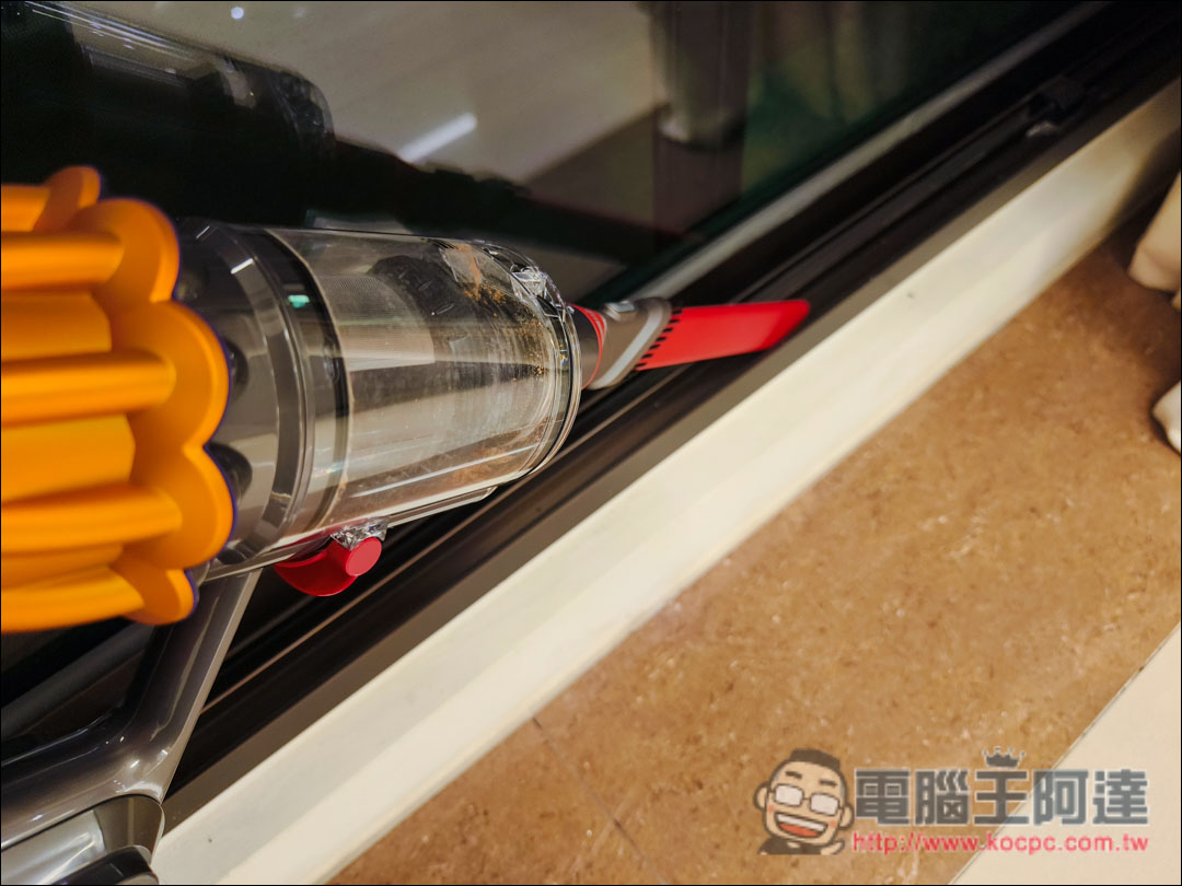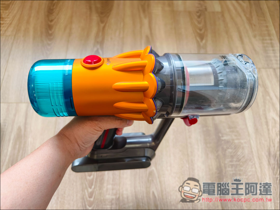 Dyson V12s本身主機是1.5公斤,主機加上長管再加上二合一吸頭也不會覺得太重,方便清潔高處髒污,像是高櫃、冷氣出風口等地方。