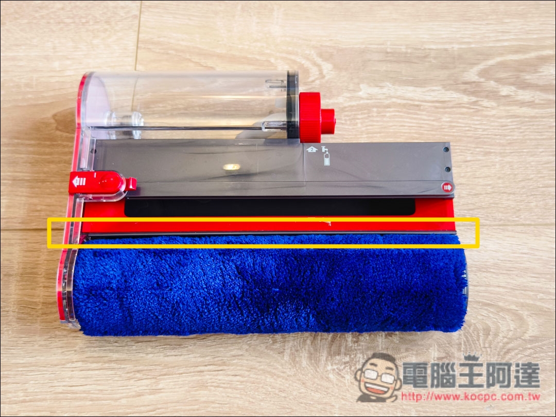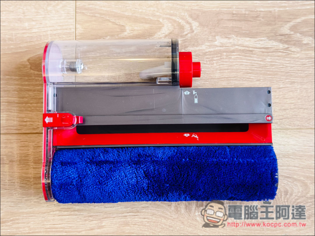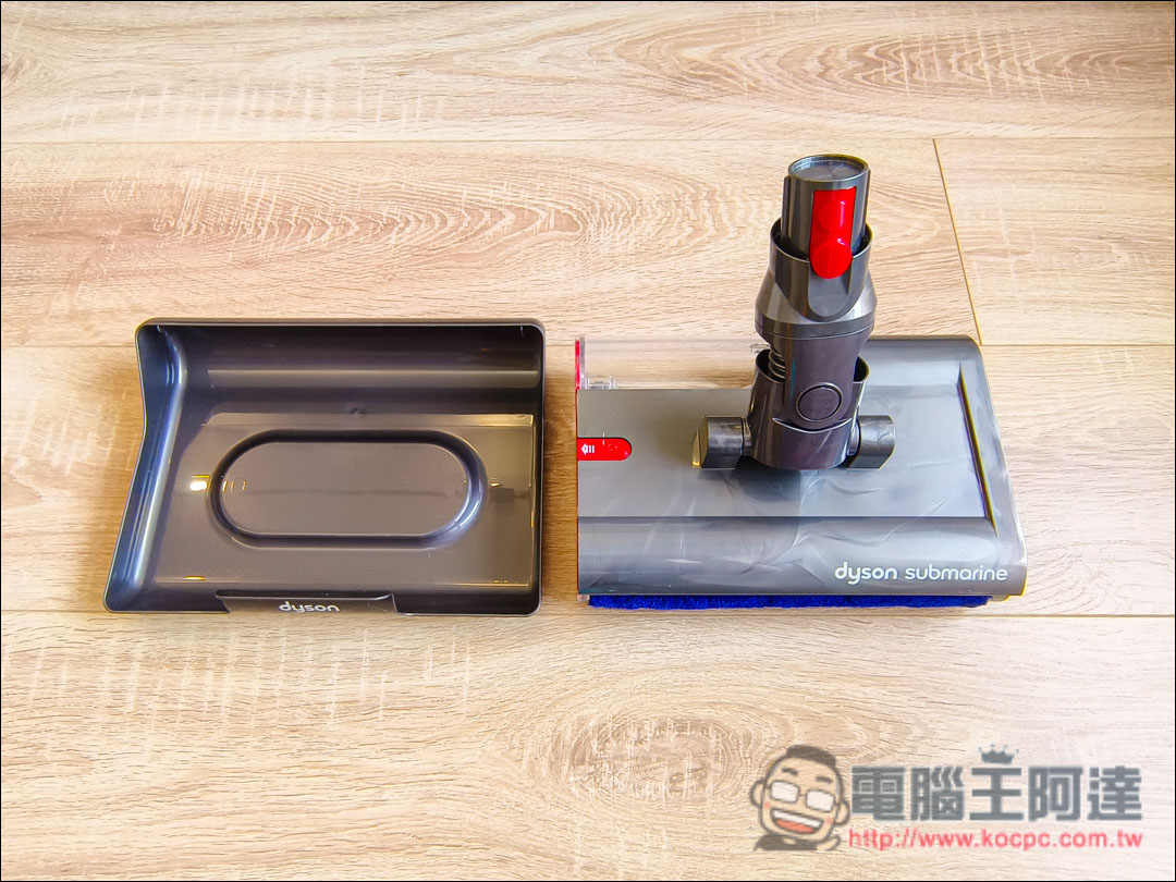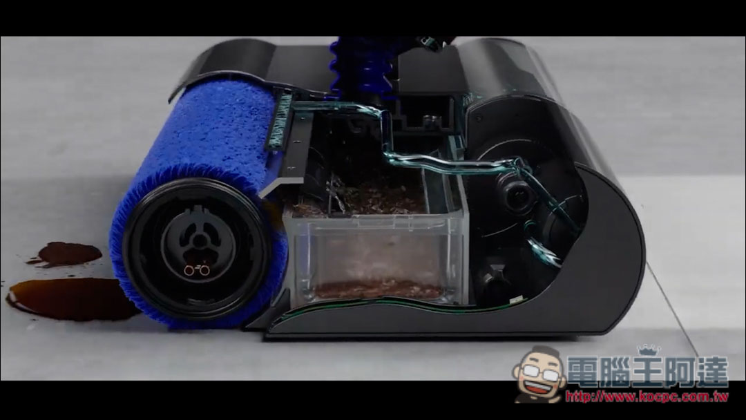 V12s主要創新科技就是這個→Dyson首創的【Submarine™洗地滾筒吸頭】,這邊除了滾筒刷外,也有配置300ml清水箱與360ml污水箱,水量足夠清潔大約33坪空間。