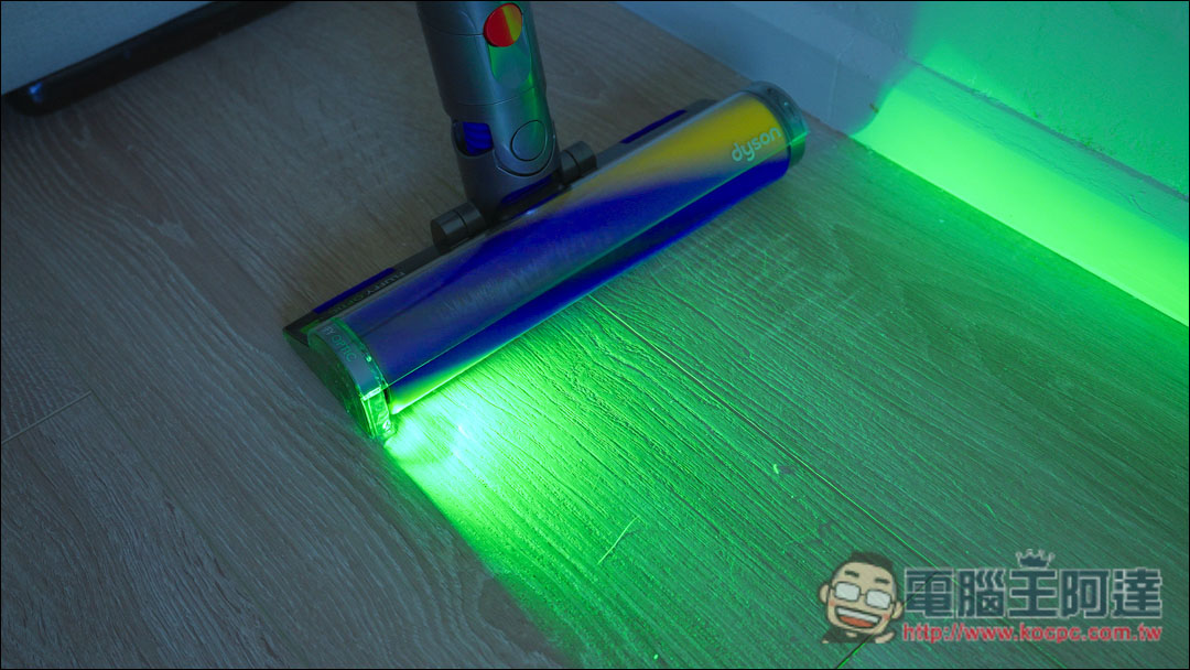 這個智慧光學偵測吸頭前方會投射綠光,經由照射會顯示出平時肉眼不易看見的灰塵,偵測高達2倍隱藏塵垢。