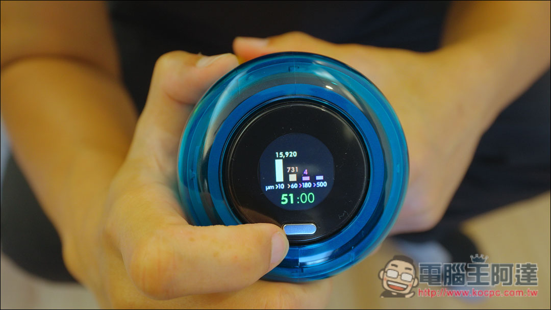 在使用時,螢幕會顯示吸入灰塵數量,並且顯示出灰塵的顆粒大小,分別有「微塵、過敏原、塵螨、糖粉」等四種大小,可以看到吸入的灰塵統計情況。
